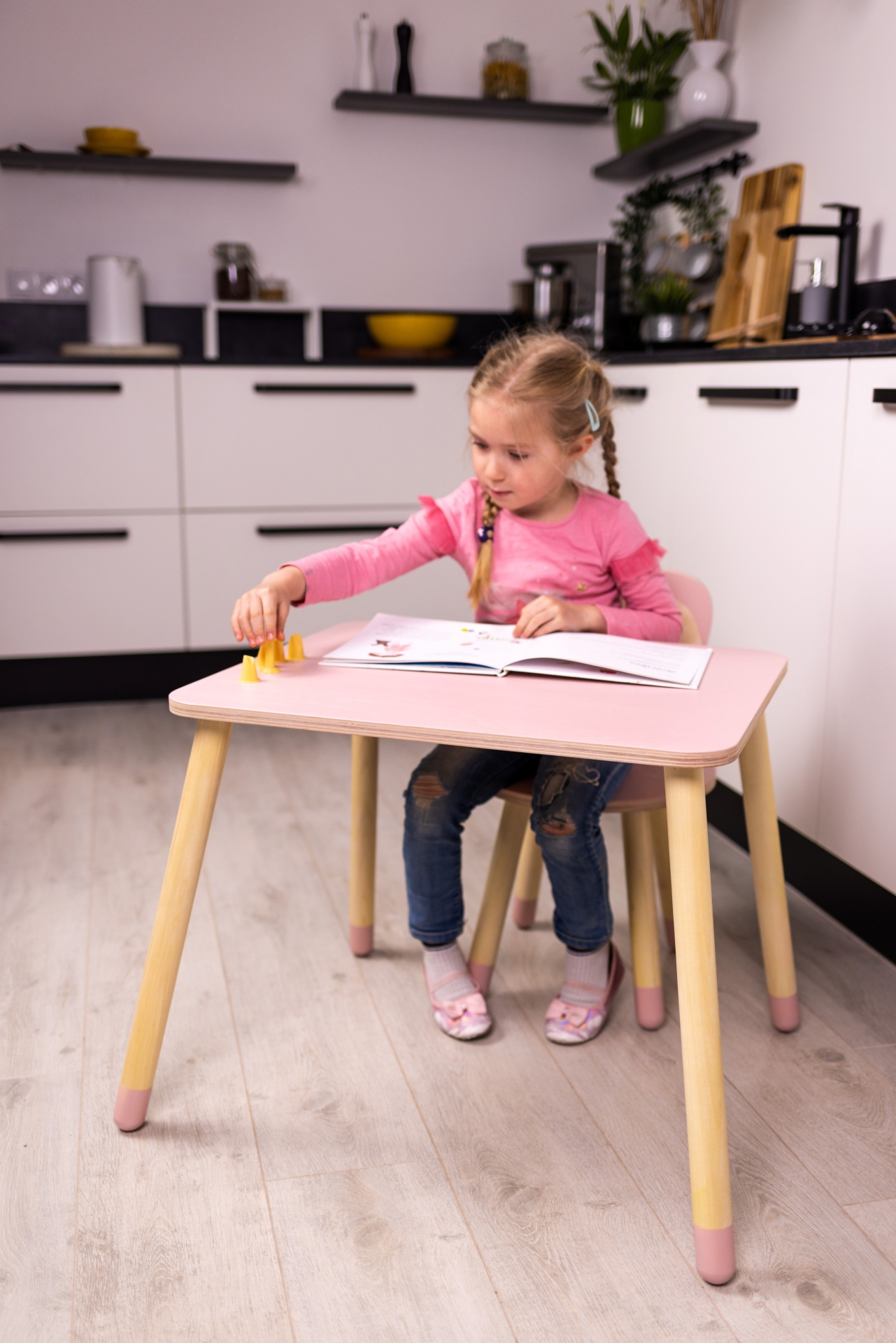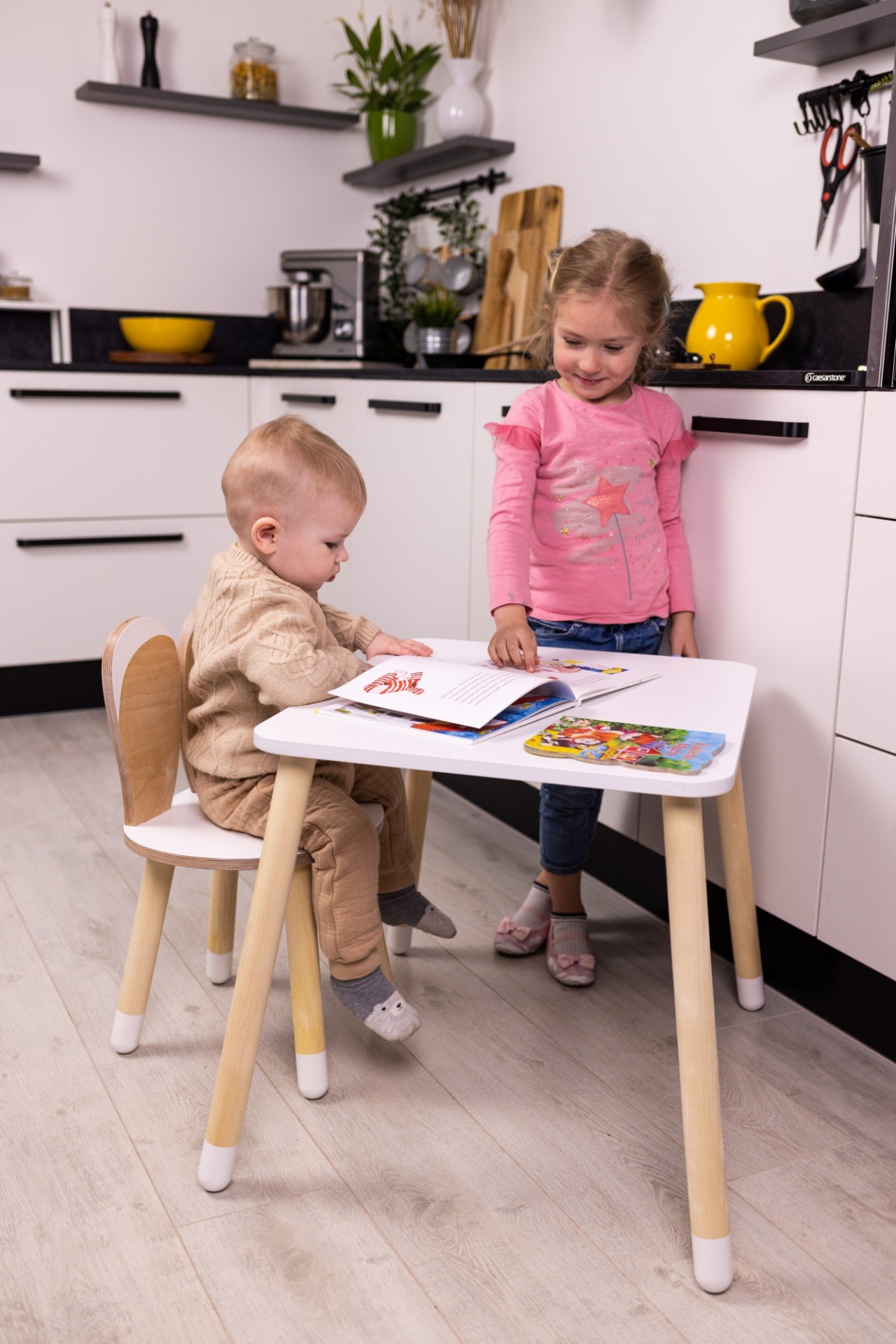 Com design lúdico e acabamento impecável, a cadeira com orelhinhas de coelho e a mesa de cantos arredondados criam um ambiente seguro, confortável e cheio de personalidade para colorir, ler, montar quebra-cabeças ou brincar por horas.