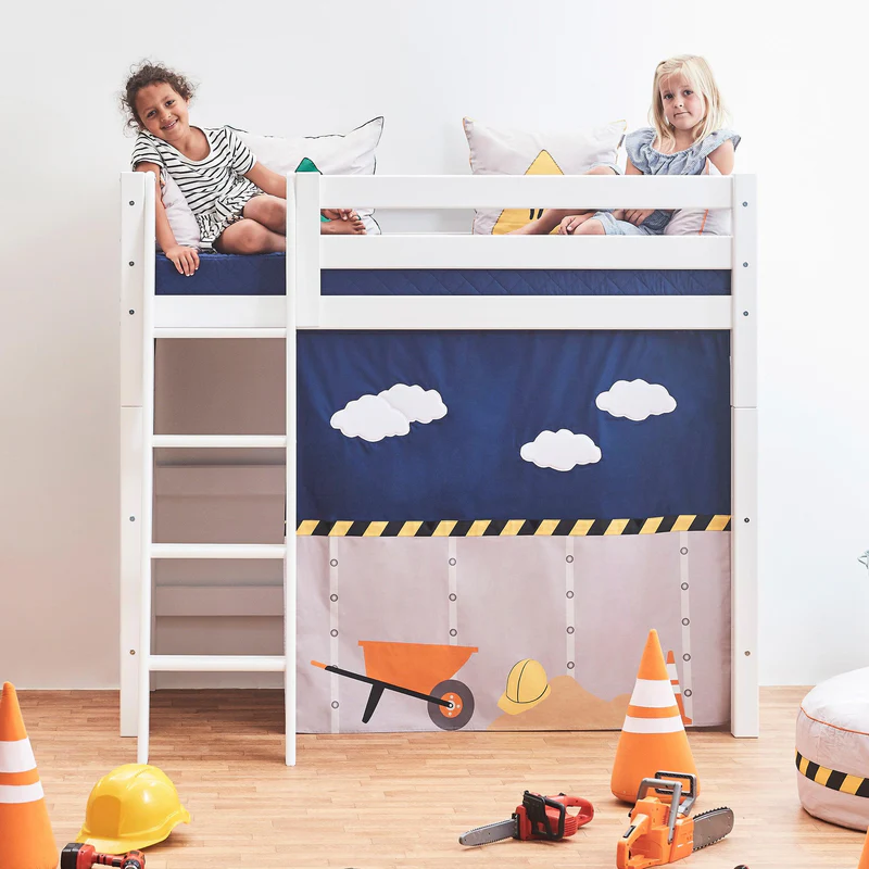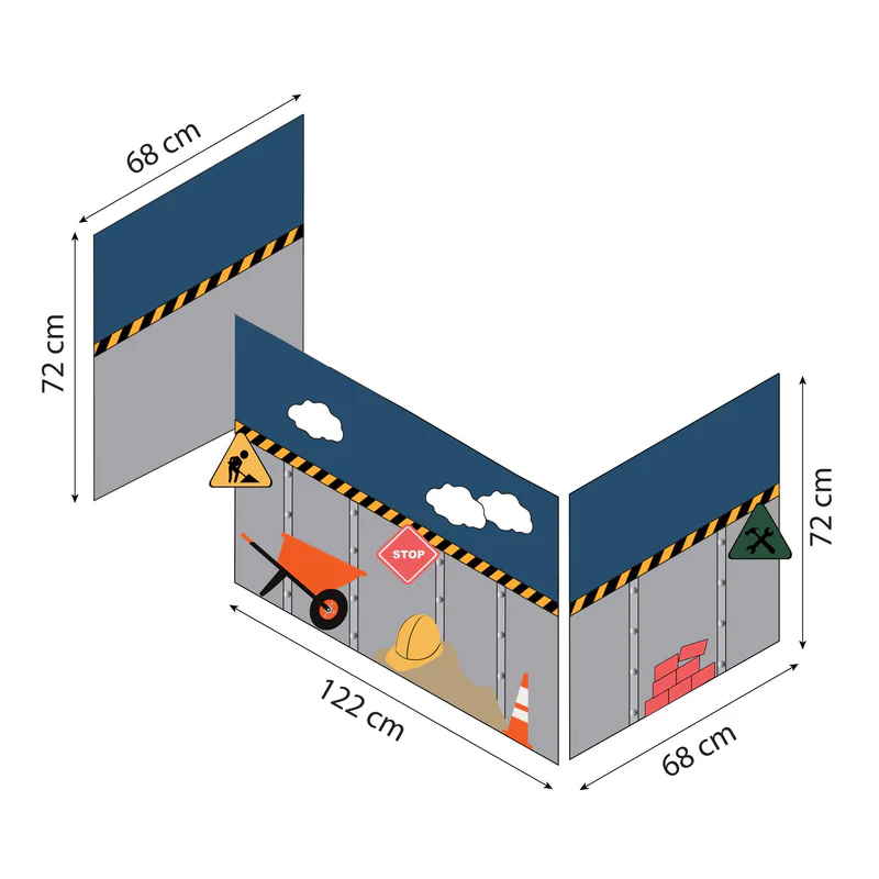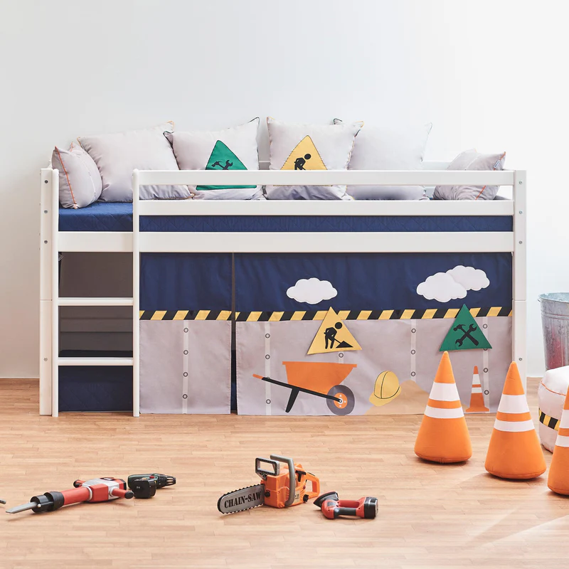 A Cortina de Cama Eco Dream – Construção transforma qualquer cama infantil numa aventura criativa e cheia de diversão. Costurada à mão com atenção aos detalhes, esta cortina apresenta um tema de construção com cone de trânsito, carrinho de mão, capacete, ferramentas e sinais de “STOP”, captando imediatamente a atenção das crianças.