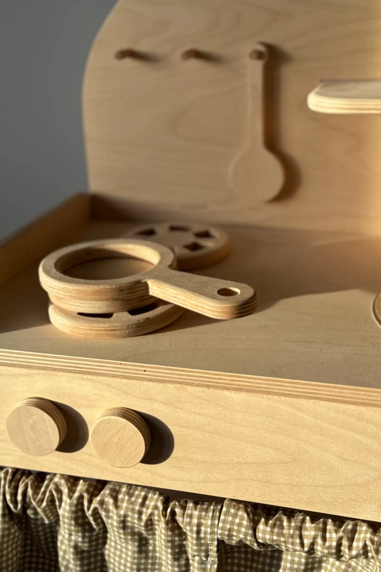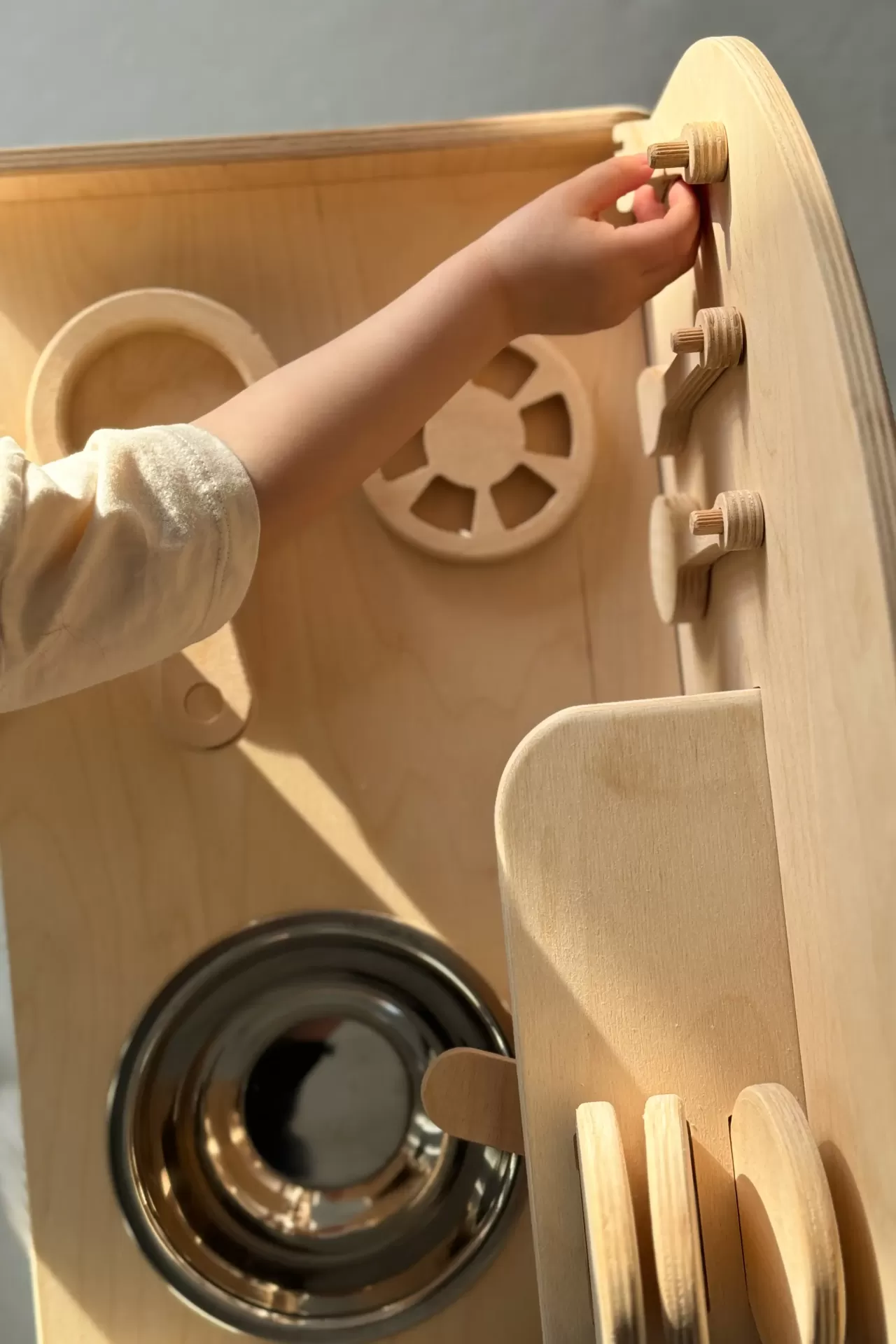 Esta cozinha de madeira com acessórios é adequada para crianças de todas as idades, com altura perfeita para brincar confortavelmente e espaço suficiente para todos os utensílios.