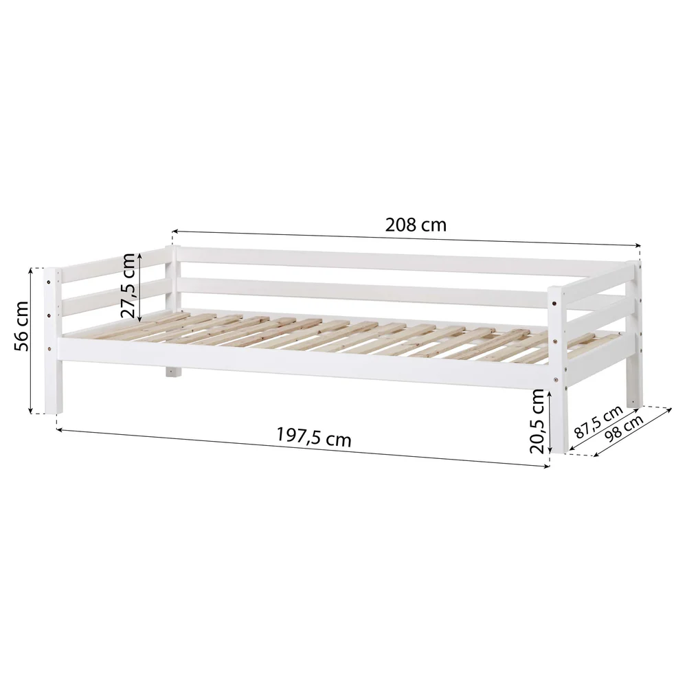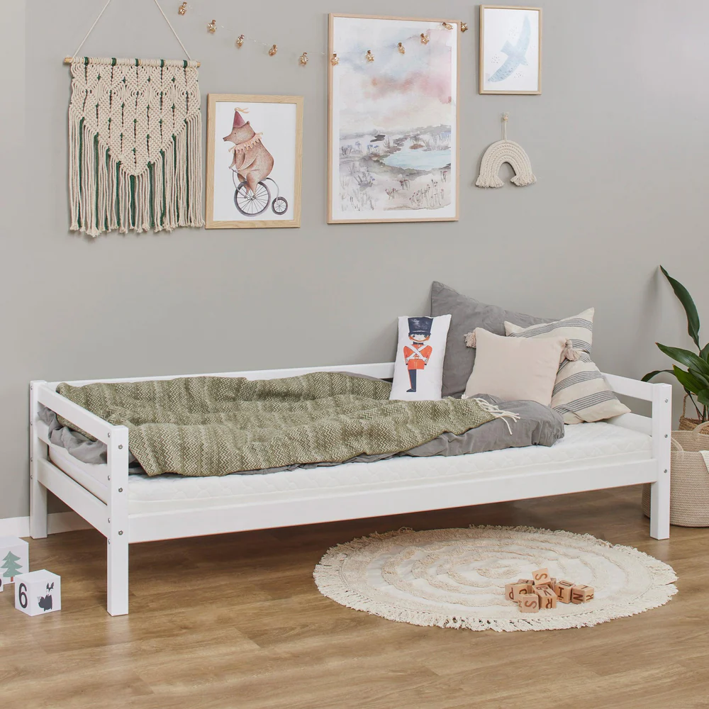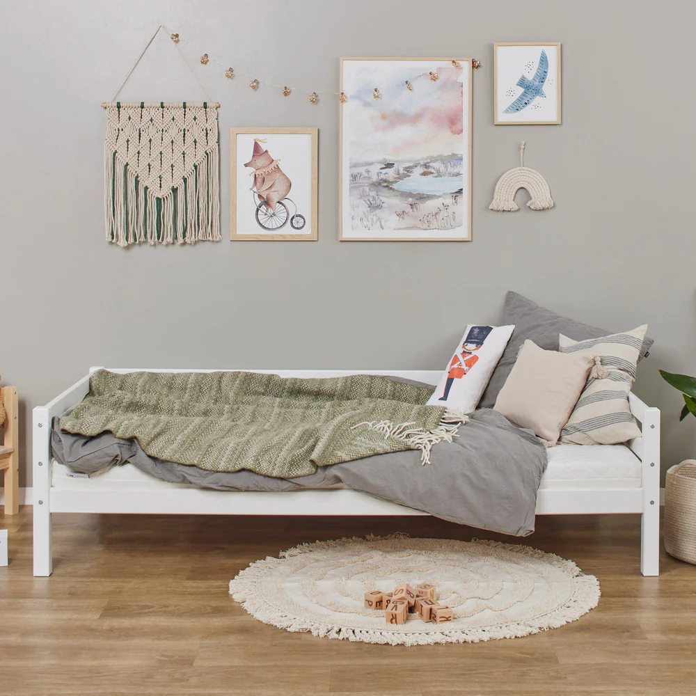 Com um design clássico e elegante em branco, adapta-se facilmente a diferentes necessidades, podendo ser transformada em vários tipos de cama ou até num sofá acolhedor, acompanhando cada fase do crescimento da criança.