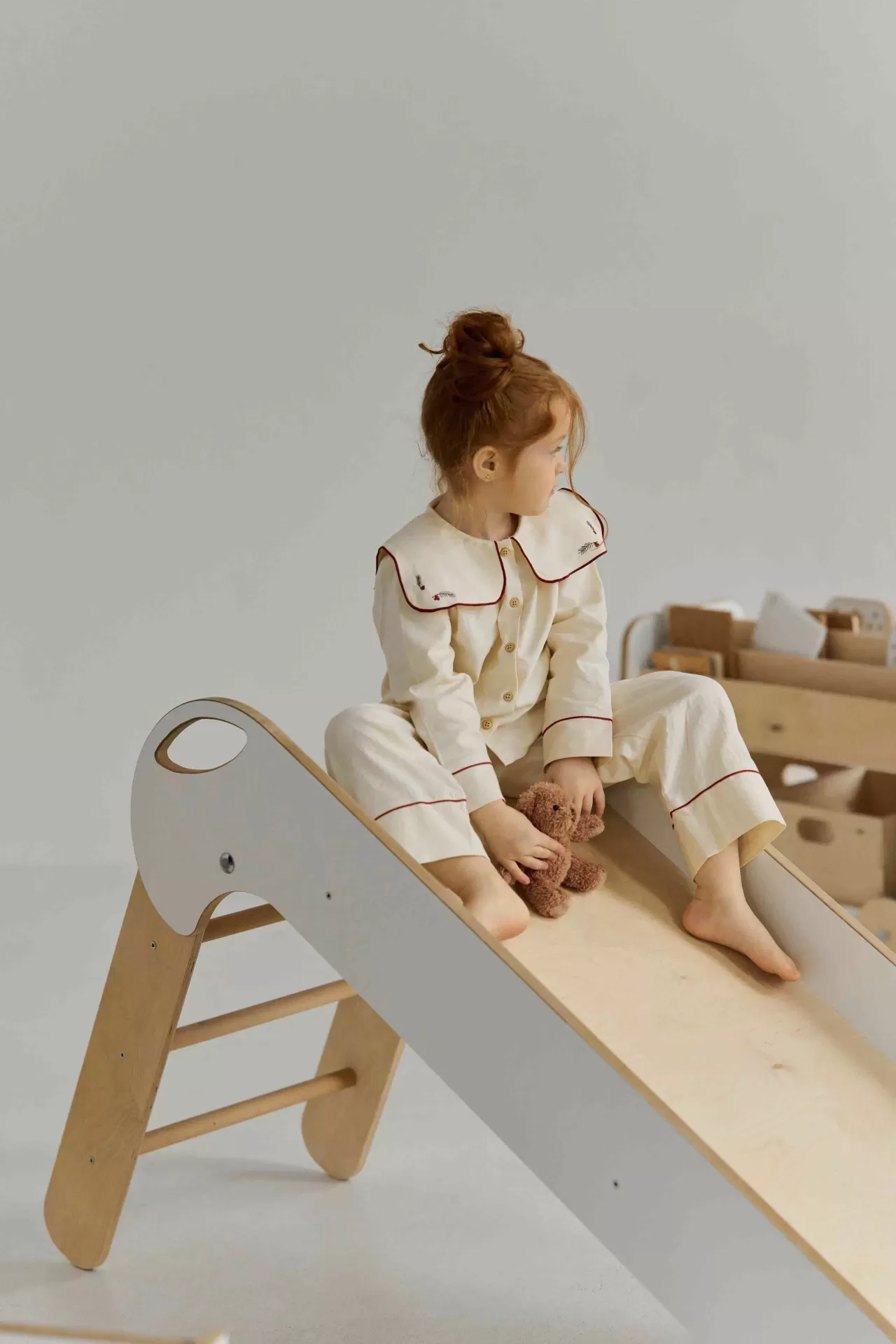 Este escorrega de madeira promove a boa forma física, o equilíbrio e a coordenação da criança.