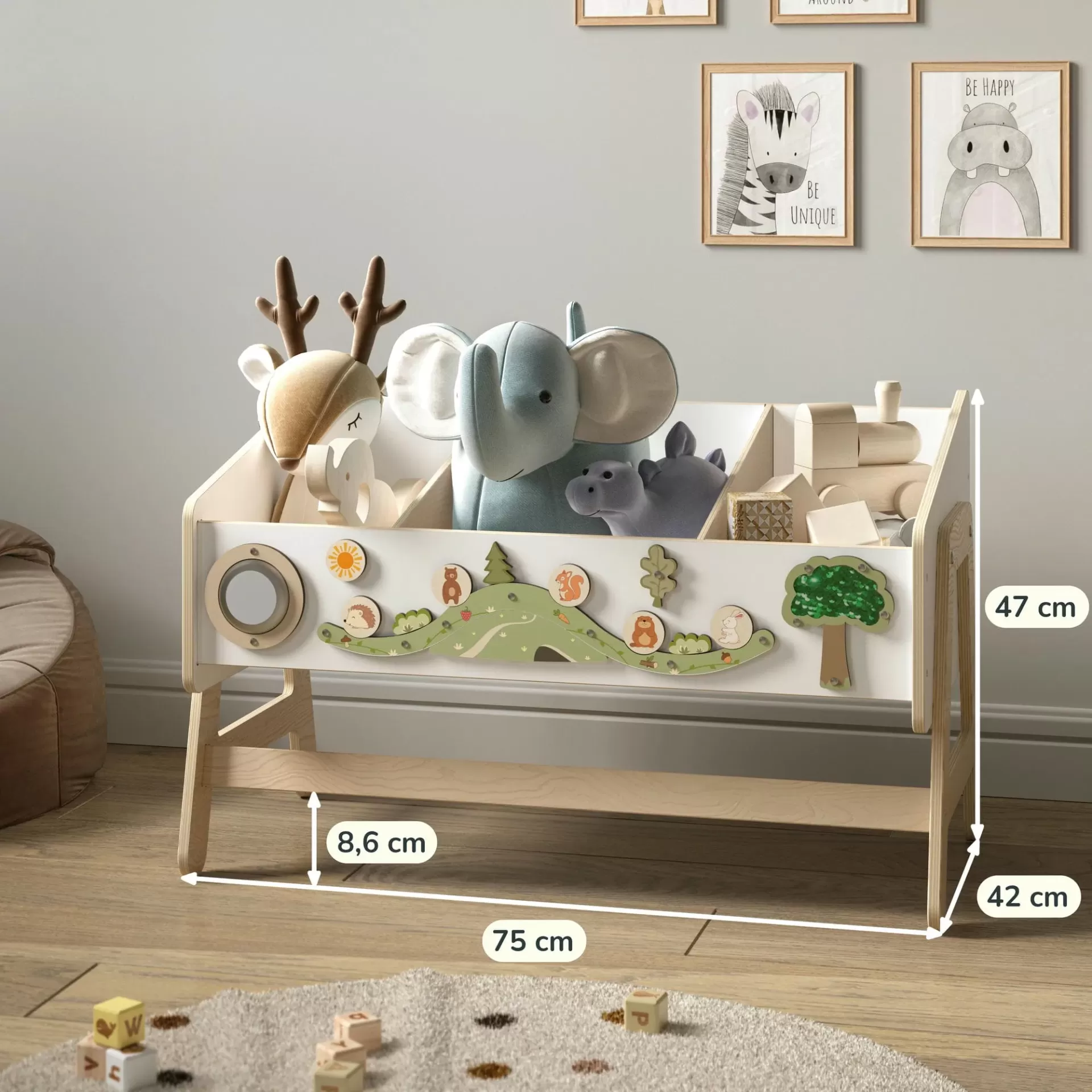 A estrutura aberta permite que a criança escolha os brinquedos de forma independente, estimulando autonomia e organização.