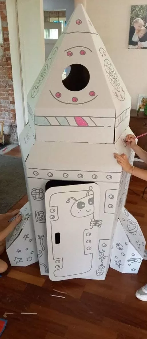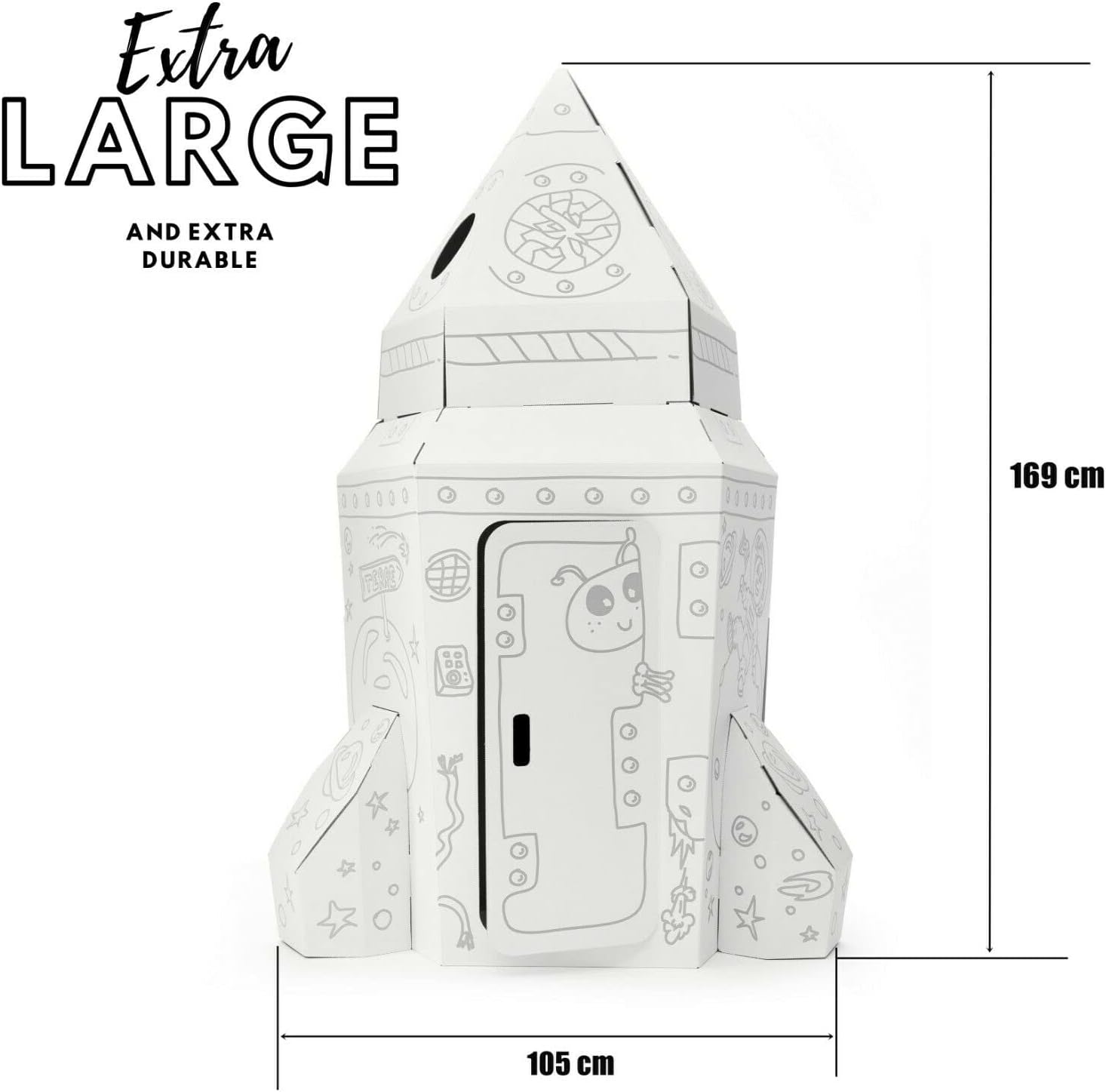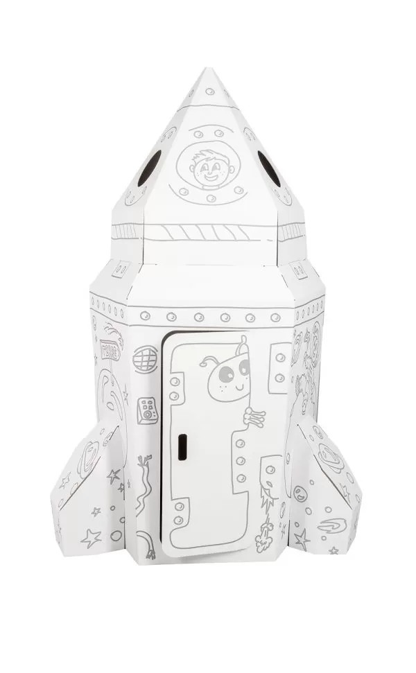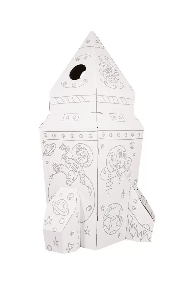 Esta nave espacial infantil em cartão é dobrável, resistente e totalmente personalizável. As crianças podem pintar, desenhar, colar autocolantes e recortar, criando o seu próprio foguetão. Com porta com dobradiças, janelas perfuráveis e divertidos detalhes de extraterrestres, a imaginação não tem limites.