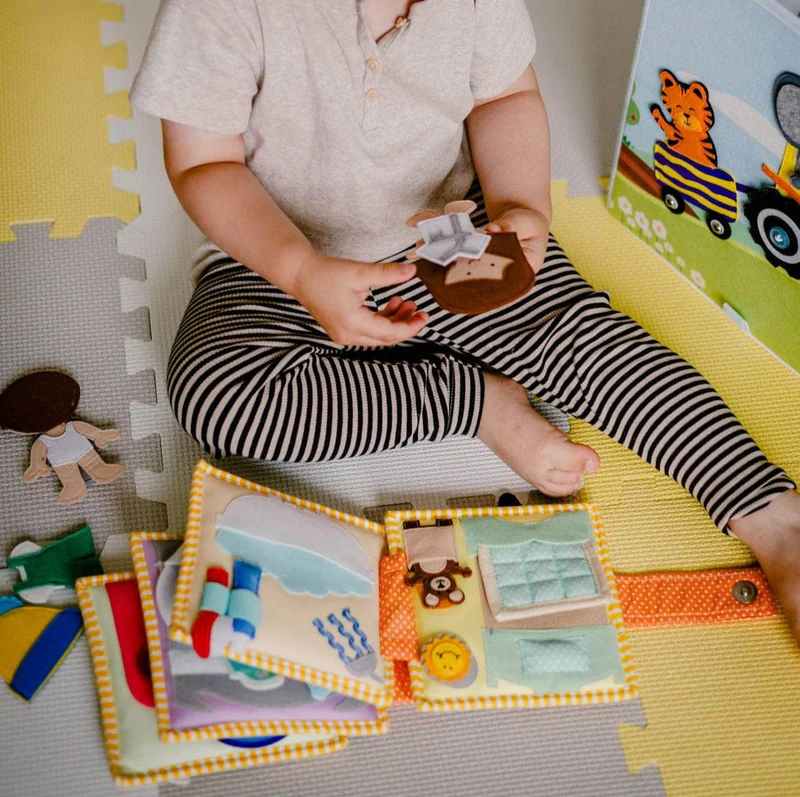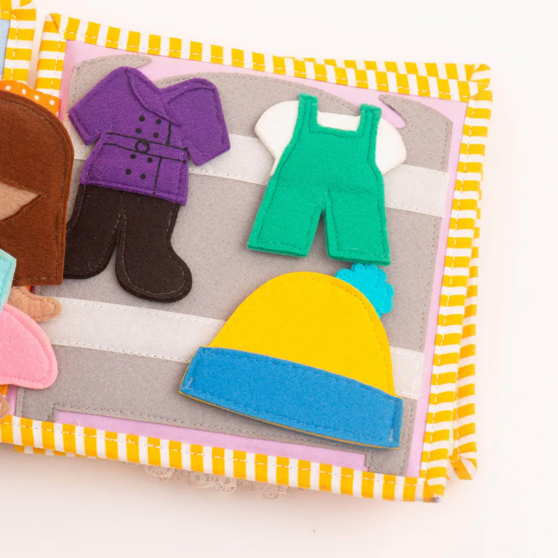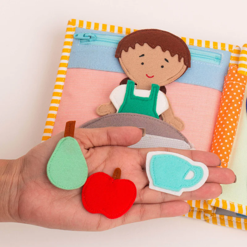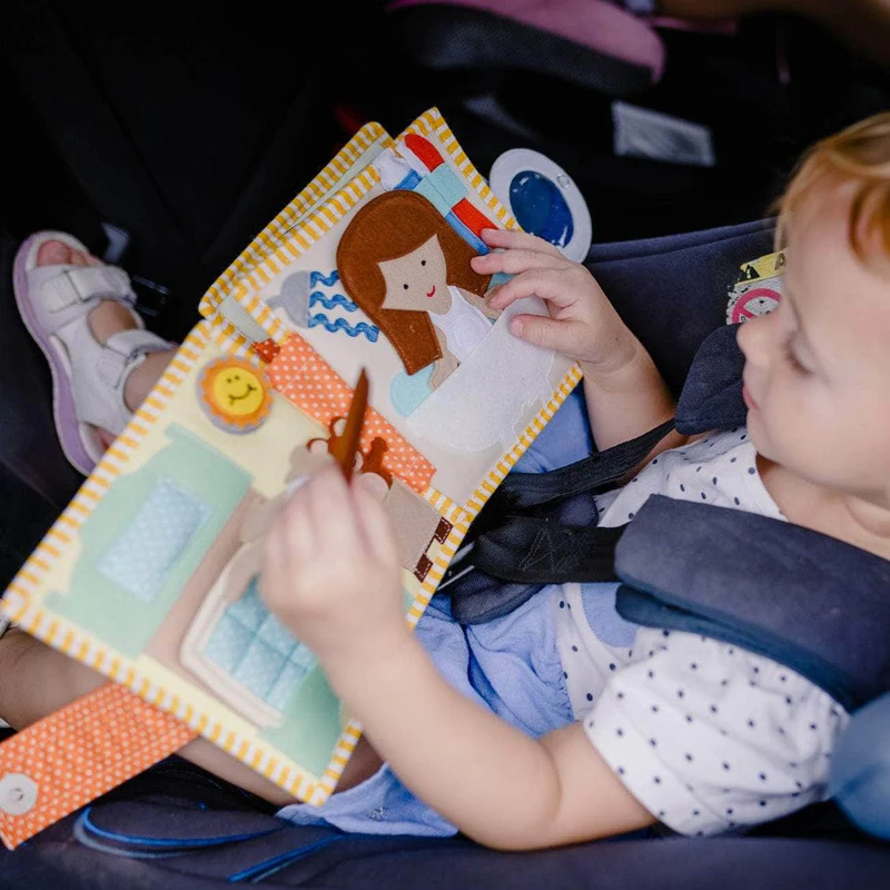 Cada página do livro sensorial infantil apresenta uma pequena cena do quotidiano, permitindo à criança explorar, abrir, fechar, abotoar, vestir personagens e realizar pequenas tarefas. Este tipo de brinquedo estimula a motricidade fina, a coordenação olho-mão, a concentração, o pensamento lógico e o jogo simbólico, ao mesmo tempo que oferece uma sensação de segurança ao ajudar a compreender a sequência das rotinas.