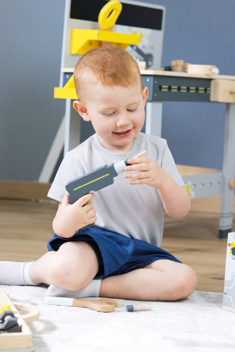 Ferramentas realistas: inclui 6 ferramentas de madeira – martelo, chave inglesa, chave de fenda, alicate, esquadro de carpinteiro com nível de bolha e chave de fenda sem fio com pontas magnéticas.