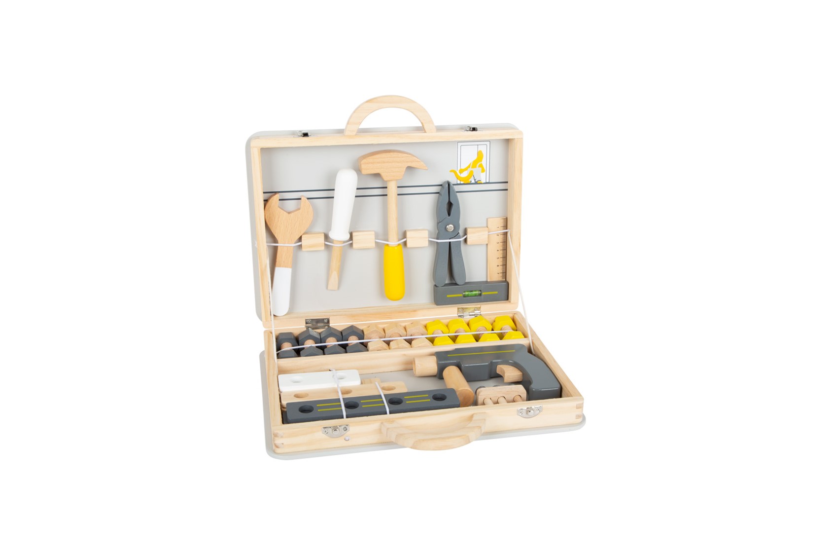 Transforme a brincadeira em aventura de construção com a Maleta de Ferramentas MINIWO! Esta prática pasta com fecho de clipe e alça de madeira mantém todas as ferramentas organizadas, enquanto as crianças exploram o mundo do faz de conta.