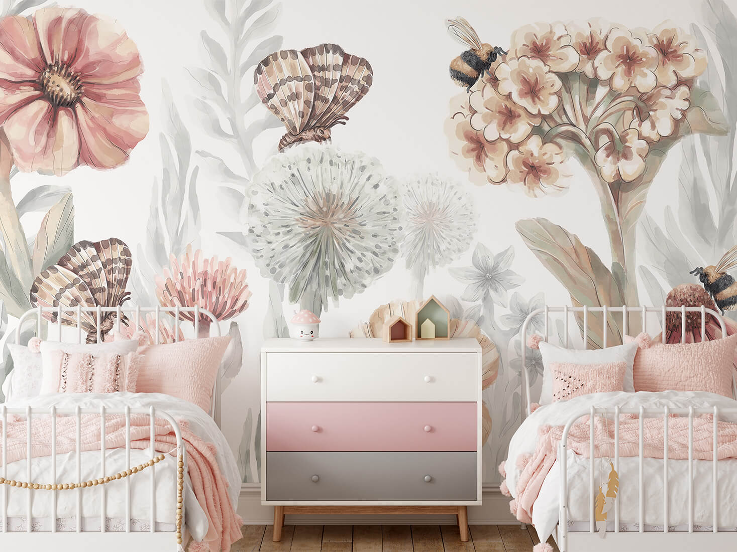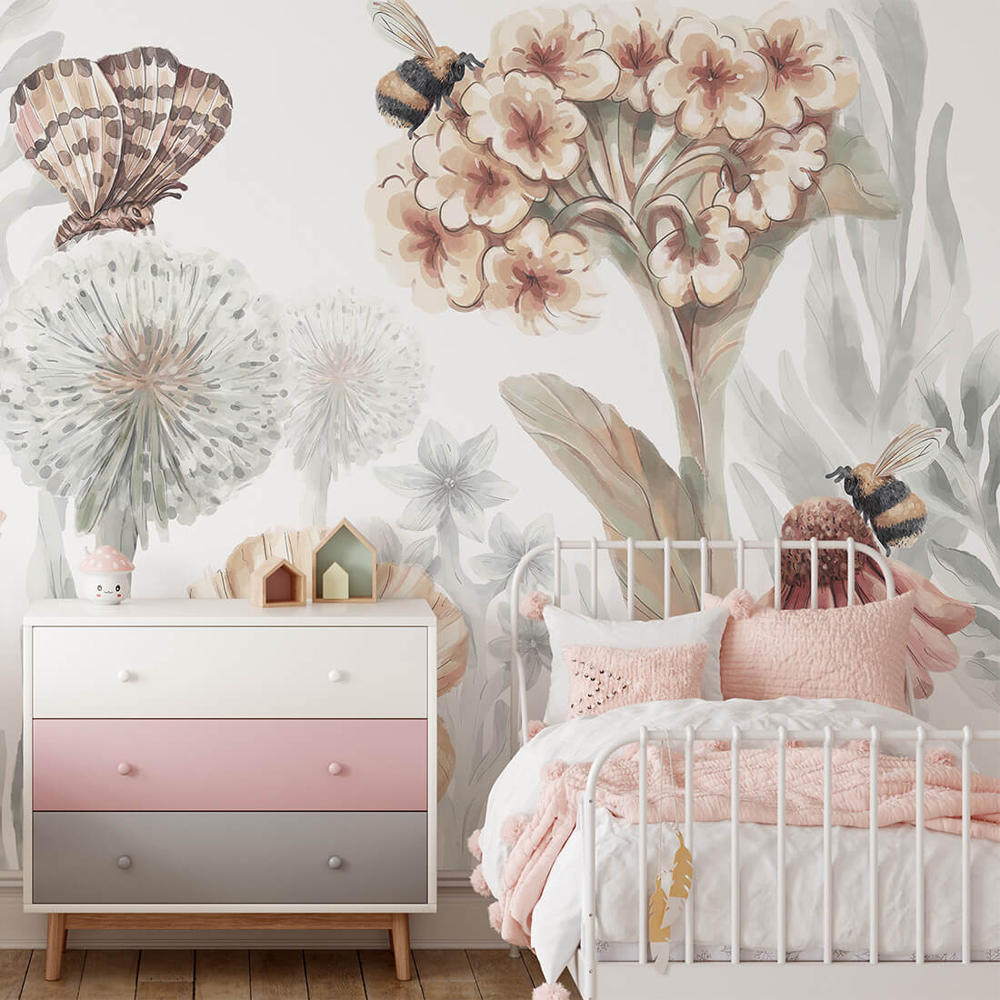O fundo delicado e claro realça os detalhes das flores, criando um espaço inspirador e acolhedor, perfeito para brincar, descansar e sonhar. Cada elemento foi cuidadosamente reproduzido para transmitir a beleza da natureza em cada parede.