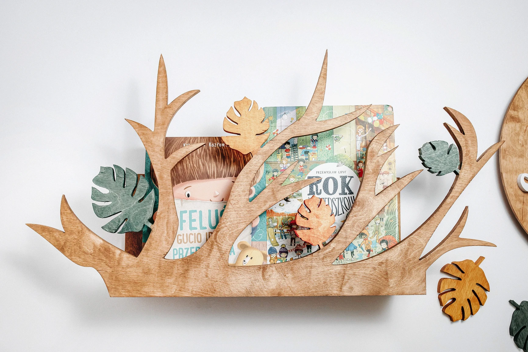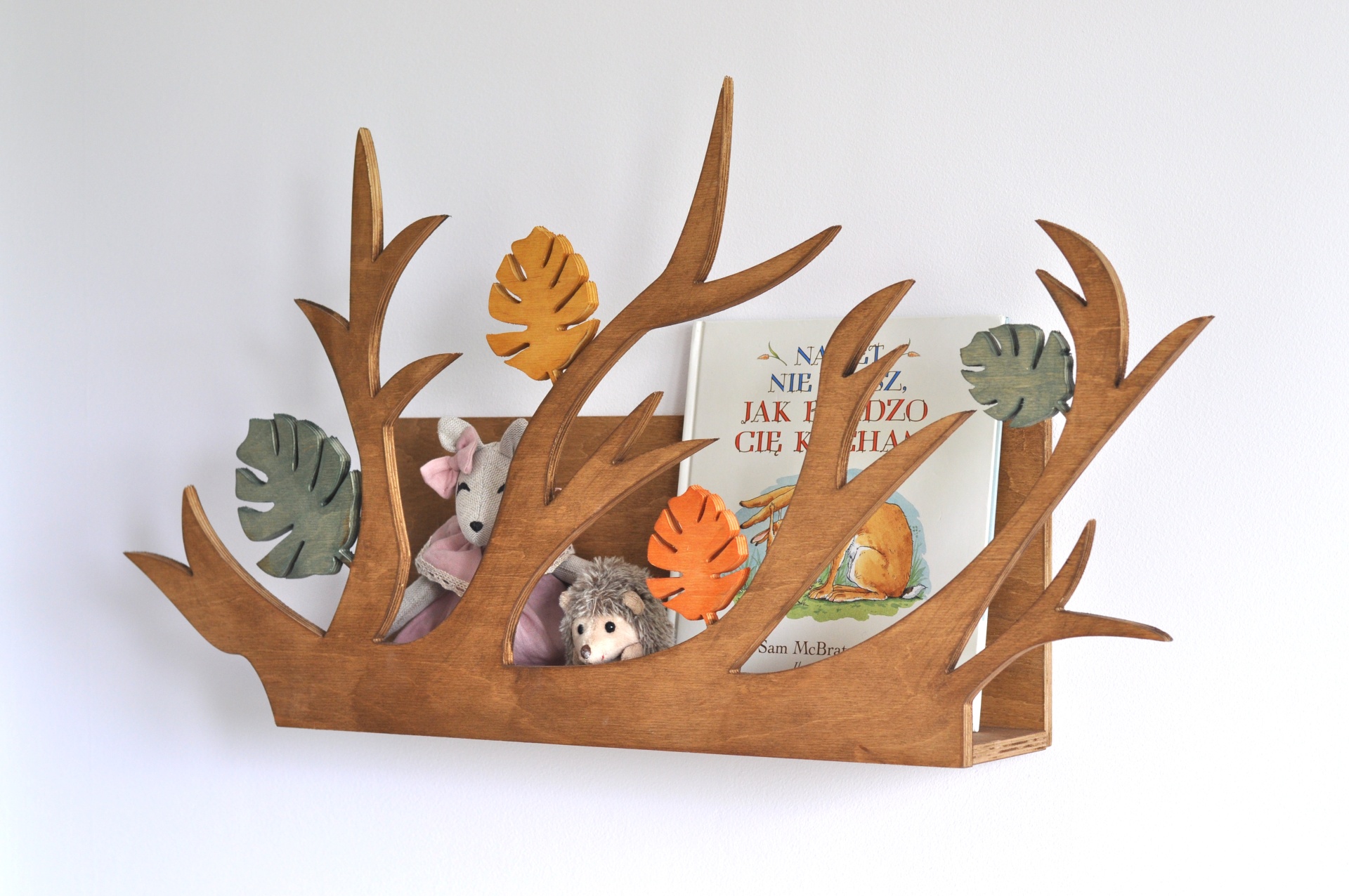 Com um design inspirado nos galhos da floresta, esta prateleira é perfeita para organizar livros, brinquedos, ursinhos de pelúcia e as decorações mais especiais que fazem parte do universo da criança.