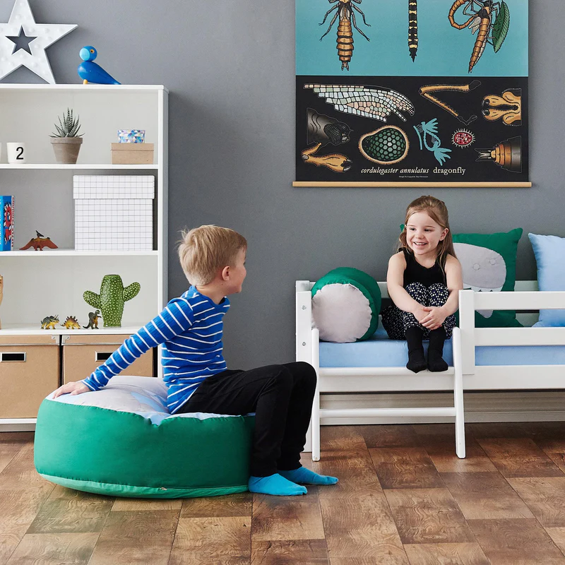 O pufe possui capa removível em algodão e enchimento de bolas de poliestireno, mantendo a forma sem perder a suavidade. Além disso, é leve e fácil de mover, permitindo que a criança leve o pufe para qualquer canto do quarto.