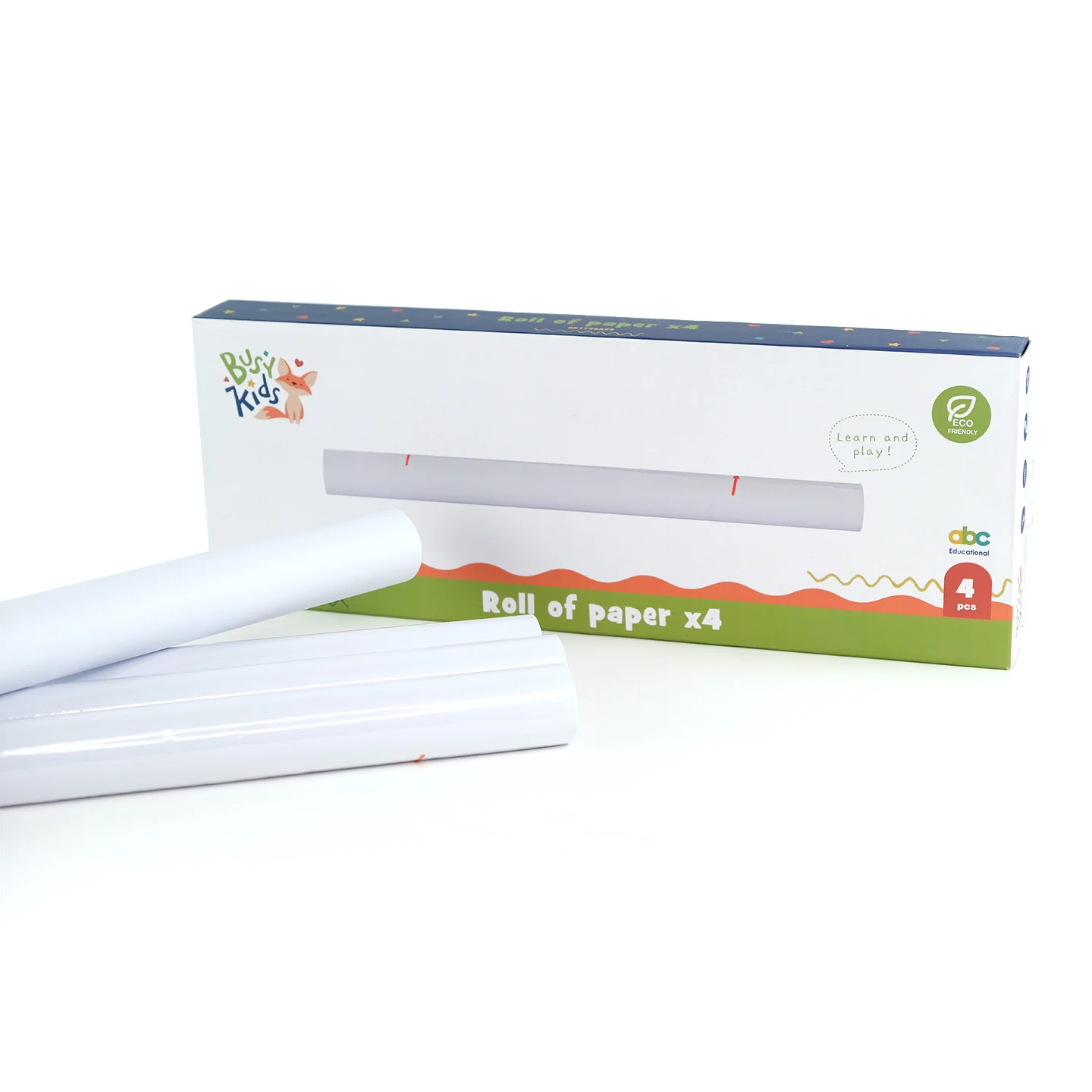 Com 44 cm de largura, este conjunto inclui quatro rolos de papel branco brilhante, ideais para usar com tintas, marcadores e lápis de cor.