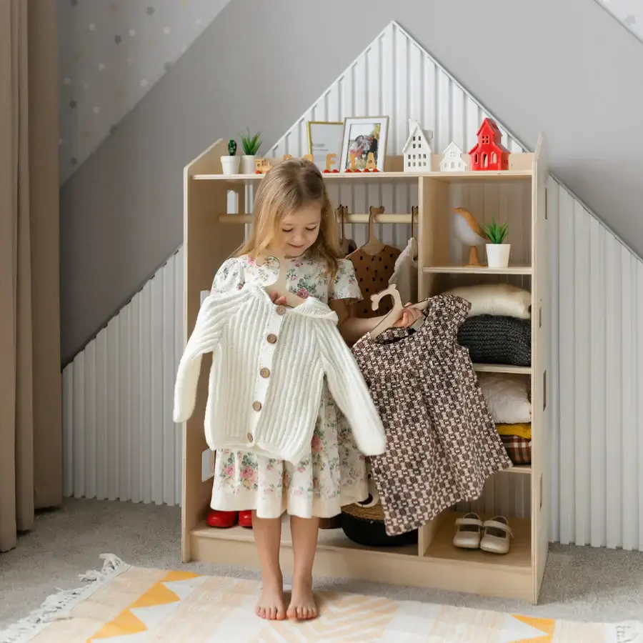 O Roupeiro Infantil Montessori em formato de casa é uma solução funcional e elegante para manter o quarto do seu filho sempre arrumado, combinando perfeitamente com as estantes de brinquedos e livros da mesma coleção.