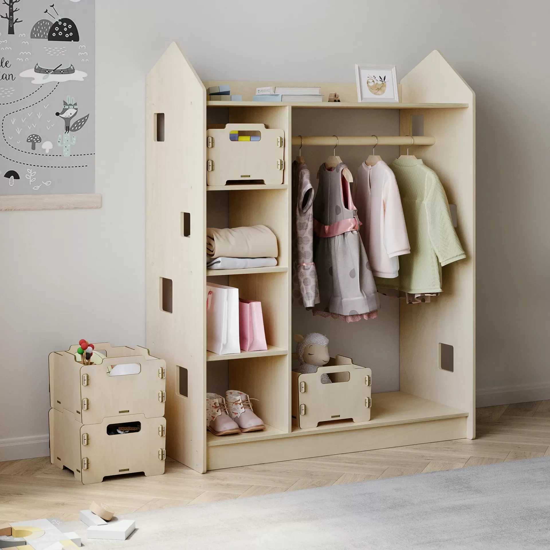 Este roupeiro segue os princípios Montessori, promovendo autonomia, participação ativa e desenvolvimento. Cada prateleira de acesso aberto permite que a criança veja e escolha as suas roupas de forma independente, aprendendo a organizar e cuidar dos seus pertences desde cedo.