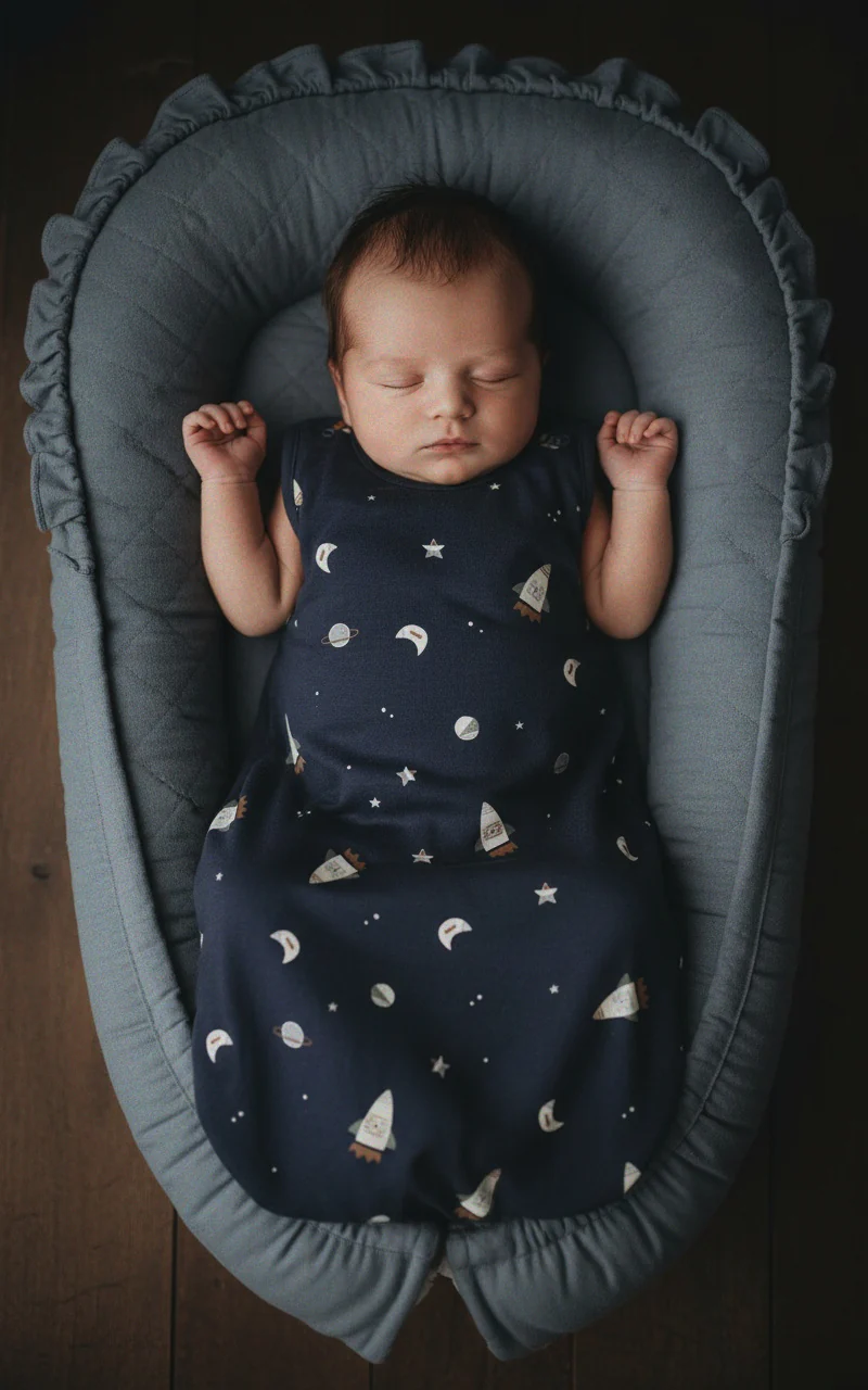 O saco de dormir Aventura no Espaço da Marangga Kids garante sono seguro e confortável para o seu bebé desde os primeiros dias de vida. Recomendado por profissionais de saúde e adorado pelos pais, substitui cobertores e edredons, evitando que o rosto do bebé fique coberto durante a noite.