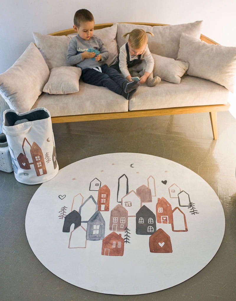 O tapete infantil CIDADE ESCANDINAVA, é feito de borracha natural biodegradável e uma camada de microfibra delicada impressa com tintas seguras.